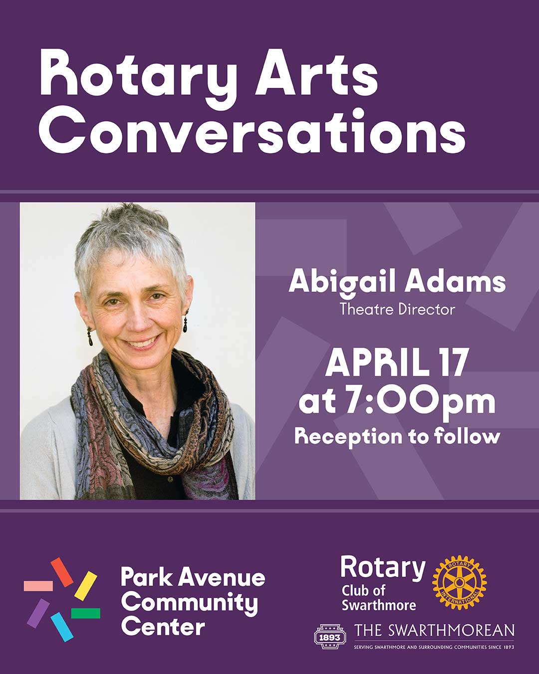 Apr 17 Rotary Arts Conversation Series: Theatre Director Abigail Adams 7:00 pm - 8:00 pm Park Avenue Community Center 129 Park Avenue, Swarthmore Event Details Get Directions